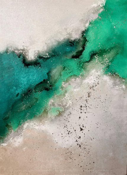 La profundidad, el movimiento, la luz y la vida se hacen presentes a través de pinceladas de azules infinitos y verdes cálidos que se funden en la arcilla que evoca el amor. Los pigmentos plateados aportan frescura, vitalidad y vida a la pintura. Esta obra de arte habla de cómo el amor es lo único que puede salvarnos, incluso en el peor momento vital.