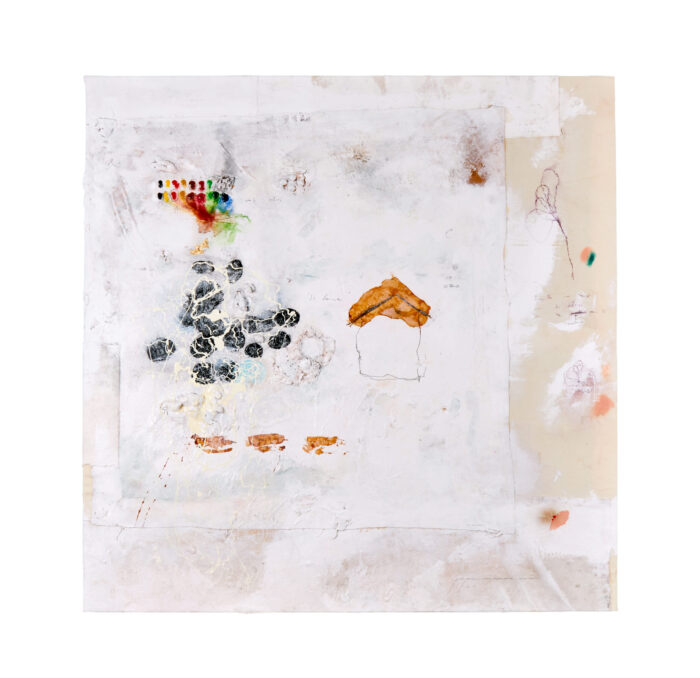 L'obra, Hacerte un refugio con las... de l'artista Joanpere massana. Mides: 120 x 120  cm. Serie: El llibre dels silencis...i dels sorolls. Any: 2019 . Tècnica: Mixta sobre tela. Espai Cavallers.