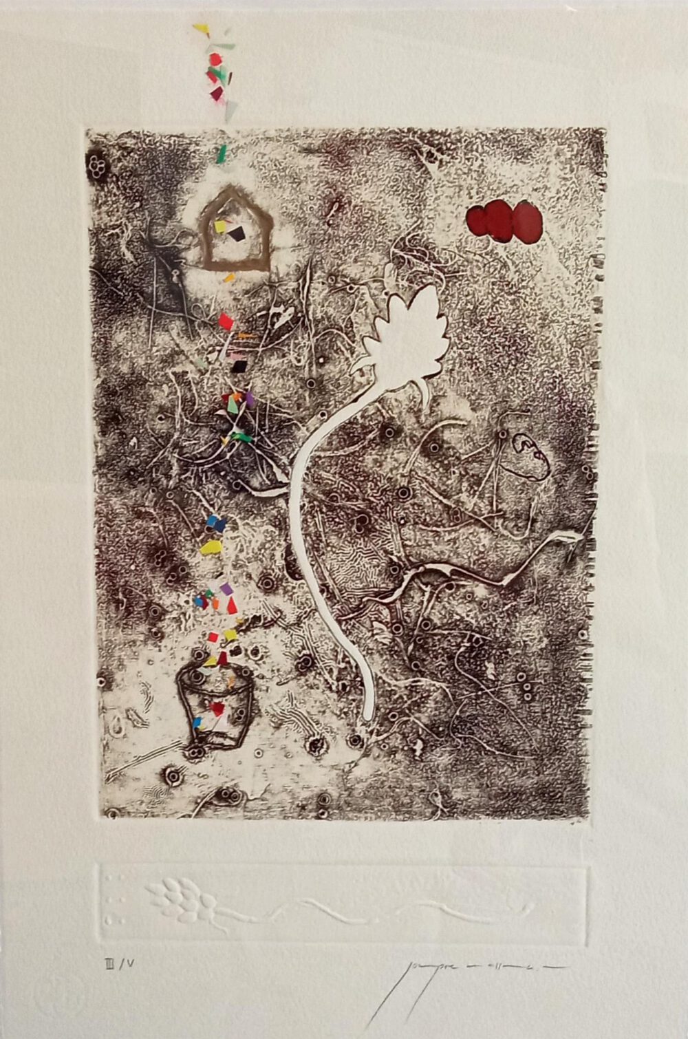 L'obra Gravat II/V és de l'artista Joanpere Massana. Elaborada amb la tècnica del gravat. Sèrie II/V. Mides 55 X 40 cm.