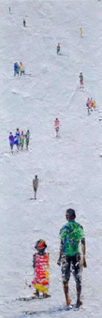 Les seves pintures representen paisatges coneguts i imaginats, on les figures humanes estan envoltades de colors vibrants, i on l’horitzó guanya protagonisme sobre la superfície texturada de la pintura. Les imatges i les emocions es revelen lentament, com el pas del temps a l’Àfrica. El seu protagonista no és només el paisatge, sinó també els rostres, “rostres exòtics i misteriosos alhora”, el mar, “el mar que es mou com un cel blau”, la gent, “gent que camina endavant amb determinació”, i els nens, “nens sense cap altra preocupació que la seva petita àrea de món”. És com si volgués capturar un instant.